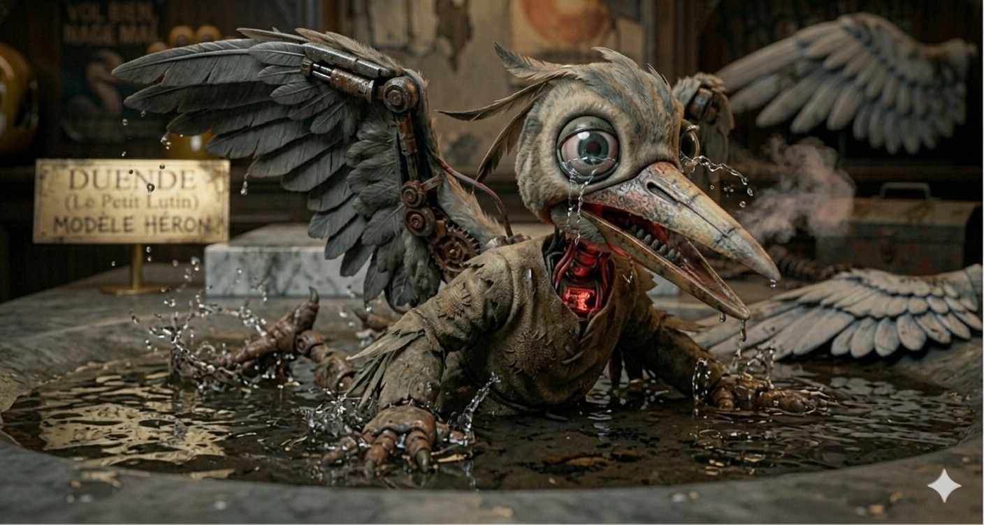 Un corps inspiré d’un héron, élancé et mécanique, combiné à une matière dorée étrange que certains appellent Golden Cheezy. Une fusion entre élégance et absurdité, entre précision animale et déformation industrielle. Mais derrière cette silhouette presque gracieuse se cache une mécanique implacable.